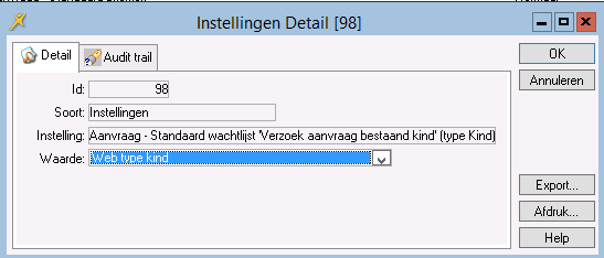 Met de parameter Aanvraag – Standaard wachtlijst 'Verzoek aanvraag bestaand kind' (type Kind) kunt u aangeven welke waarde getoond gaat worden in de kolom Wachtlijst. Door een selectie of een sortering te maken op deze waarde krijgt u een indruk hoeveel ouders via flexweb zichzelf een nieuw kind bij uw organisatie inschrijven voor dit kind opvang aanvragen.