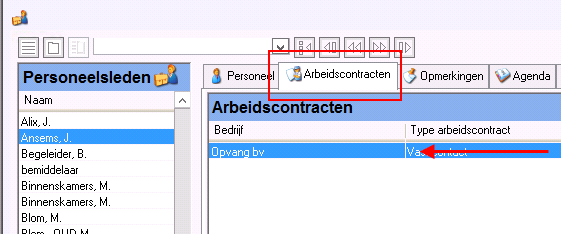 Klik op het tabblad Arbeidscontracten van de medewerker en selecteer het desbetreffende Arbeidscontract.