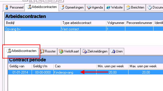 Klik op het deeltabblad Arbeidscontracten en selecteer de desbetreffende Contractperiode.