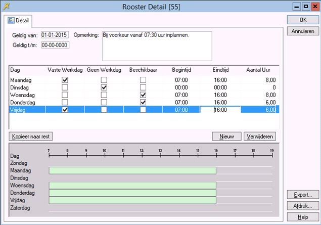Geef aan op welke werkdagen en op welke tijden de medewerker kan worden ingezet. Zie ook: Uitleg invoervelden Rooster Detail.