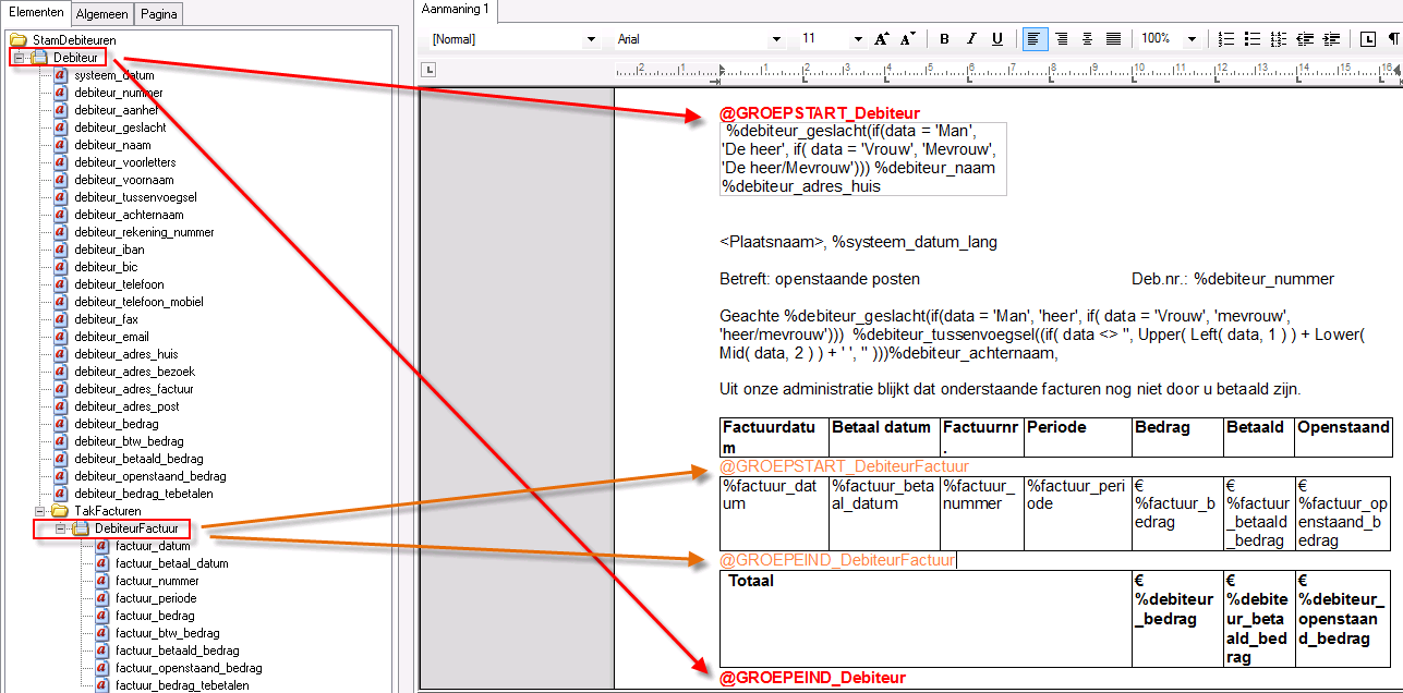 Elk schema kent ook een eindpunt. Daarbinnen vindt u de zogenoemde elementen of anders gezegd de (samenvoeg)velden vanwaaruit de informatie opgehaald wordt. Deze worden aangegeven als @GROEPEIND_<naam eindpunt>. Binnen een @GROEPSTART en @GROEPEIND kunnen andere start- en eindpunten liggen. Om gebruik te kunnen maken van de samenvoegvelden van deze start- en eindpunten plaatst u deze tussen het eerdere start- en eindpunt.