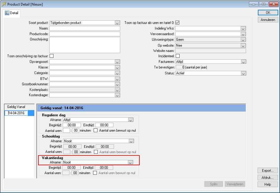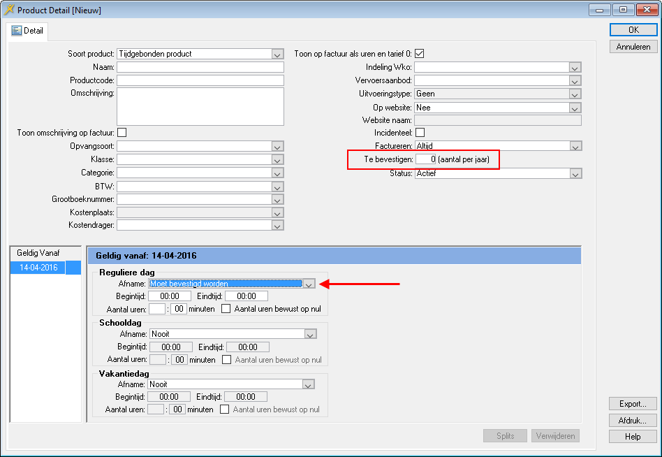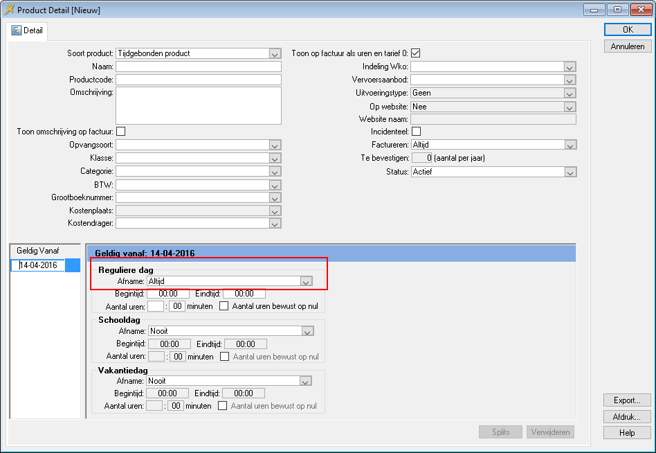 Om de inrichting van de producten voor minder dan 52 weken te vergemakkelijken hierbij een overzicht hoe u de producten maakt t.a.v. de velden Afname op....:
