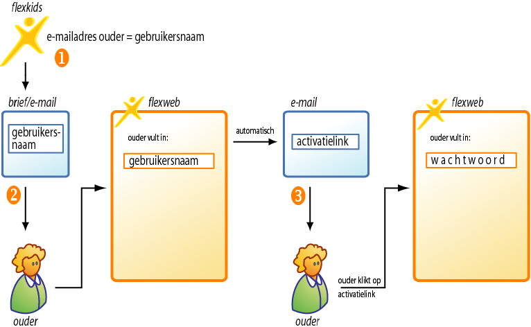 [1] De opvangorganisatie kent de ouder een gebruikersnaam toe. Voor de gebruikersnaam wordt gekozen uit één van de e-mailadressen (thuis, werk of mobiel) die in flexkids bij de (betalende) ouder zijn ingevoerd.