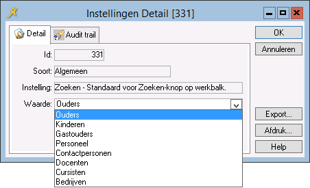 Met deze systeemparameter bepaald u dat het standaard zoekscherm dat geopend wordt wanneer het ikoon Zoeken op de werkbalk aangeklikt wordt. Het is ook mogelijk om flexkids zo in te stellen dat u geen gebruik maakt van het zoekvenster bij het invoeren van een nieuwe relatie. U doet dat door de systeemparameter Nieuwe zoekmethode gebruiken de waarde Nee te geven. Wij raden dit af omdat u dan geen controle hebt op dubbele invoer van personen en instellingen.