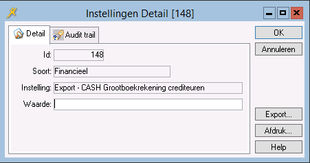 Op deze parameter kan de grootboekrekening crediteuren(maximaal 6 karakters) voor het boekhoudpakket CASH ingevoerd worden ten behoeve van de export van crediteuren.