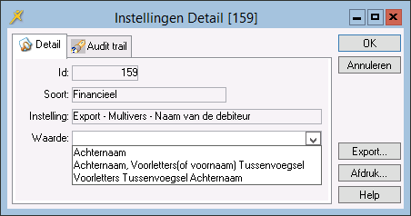 Met deze parameter wordt bepaalt in welk formaat de naam van de debiteur geëxporteerd moet worden naar het boekhoudpakket Multivers.