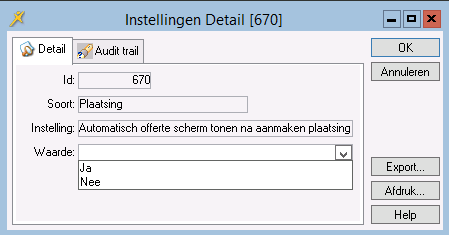 Met de instelling van deze parameter kunt u, direct na het maken van de plaatsing, het scherm Offerte Generatie automatisch laten openen. U kunt vervolgens direct de offerte genereren. U stelt de parameter Automatisch offerte scherm tonen na aanmaken plaatsing in op de waarde Ja.