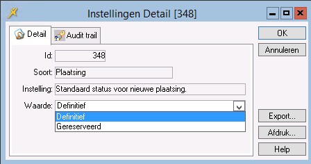Met deze parameter kunt u aangeven dat in het venster Plaatsing bij het veld Status standaard de waarde Definitief of Gereserveerd word getoond.