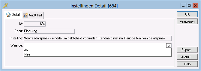 Met de instelling van deze parameter op Ja wordt het selectievakje standaard ingeschakeld van de geldigheid zodat de aan te maken voorraden nooit voorbij de Periode t/m van de afspraak liggen.