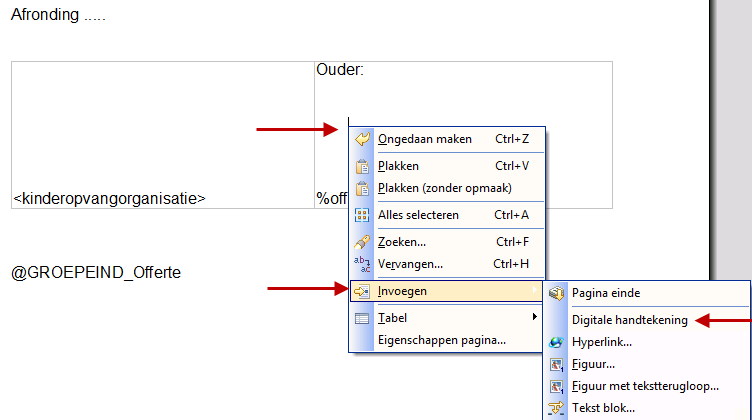 Klik in het documentsjabloon en kies met de RM-knop op de plaats waar u in het document de digitale handtekening van de ouder wilt hebben