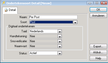 Handtekening: Als u bij Soort de waarde Post heeft geselecteerd, dan kunt u in het veld Handtekening geen andere waarde selecteren. Als u bij Soort de waarde E-mail heeft geselecteerd, dan is het veld Handtekening ingesteld op Ja. U mag deze instelling NIET wijzigen. Als u bij Soort de waarde E-mail & Inbox heeft geselecteerd, dan is het veld Handtekening ingesteld op Ja. U mag deze instelling NIET wijzigen.