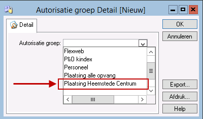 - Selecteer via het Keuzelijst venster de juiste Autorisatie groep.