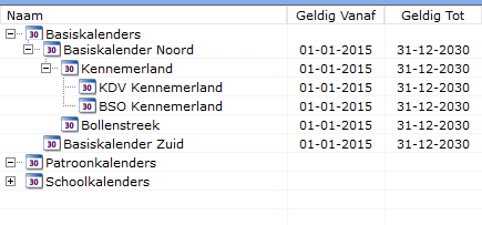 Een kalenderreeks wordt opgebouwd vanuit de betreffende Basiskalender. Dit wordt weergeveven in een boomstructuur. Bijvoorbeeld: