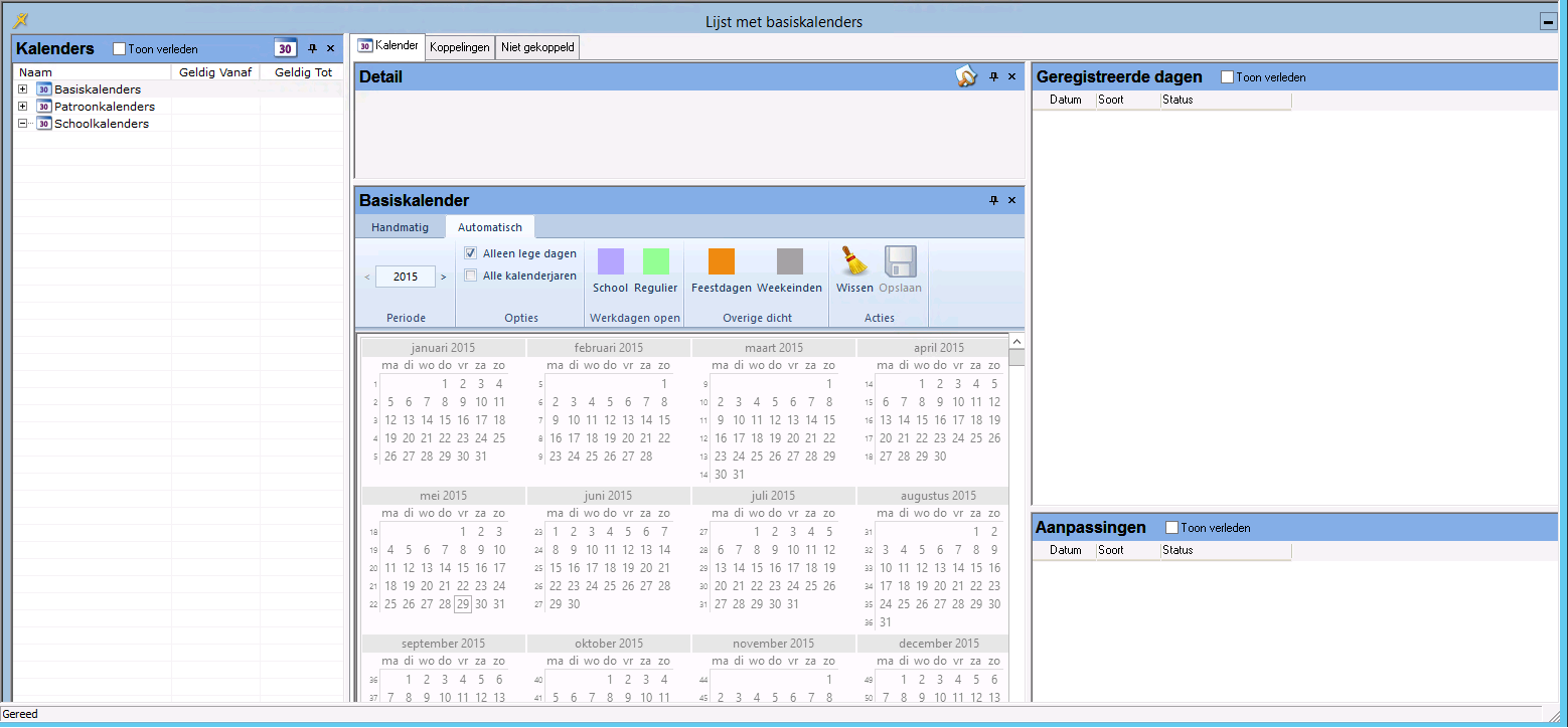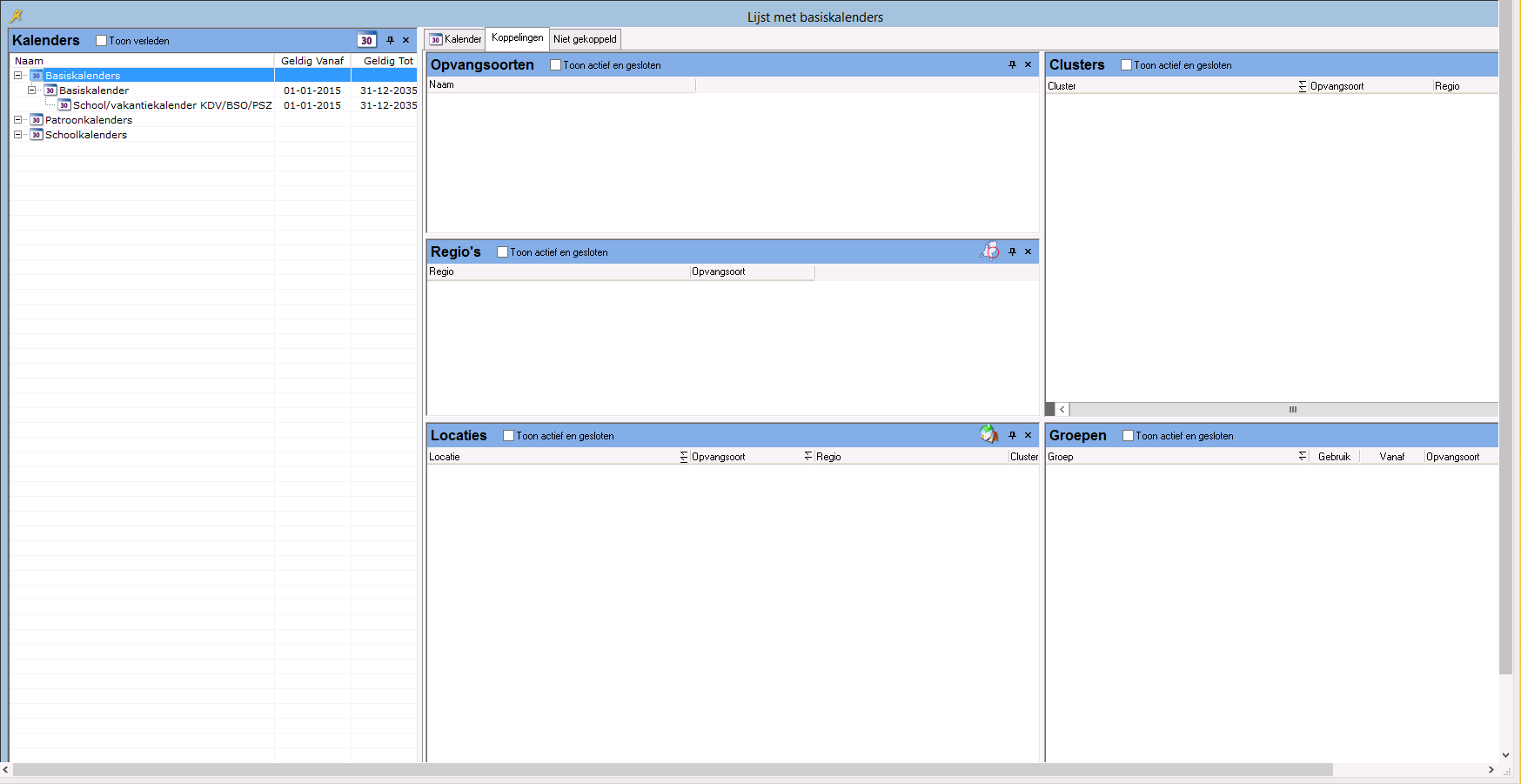 Zodra u klikt op de optie Basiskalenders ziet u volgende vensters. De kalenders bestaan uit drie tabbladen: Kalender, Koppelingen, Niet gekoppeld.