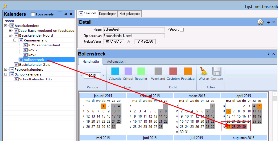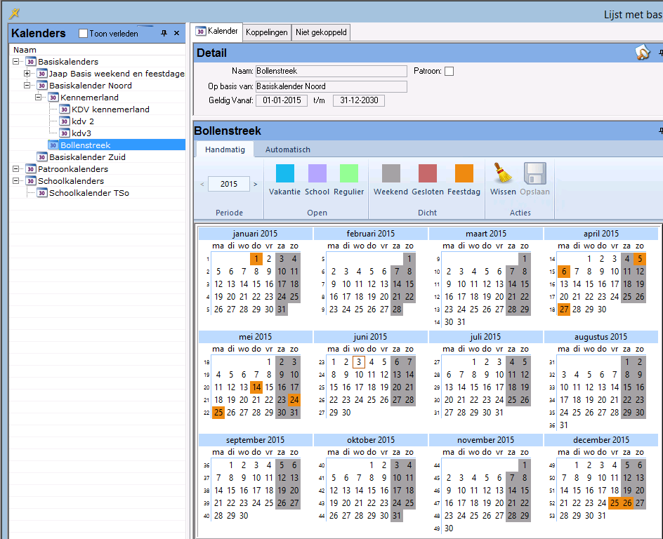 In de kalender Bollenstreek zijn alleen de weekenden en feestdagen ingevuld. Deze zijn overgenomen uit de Basiskalender Noord (via de menukeuze Nieuw op basis van.)