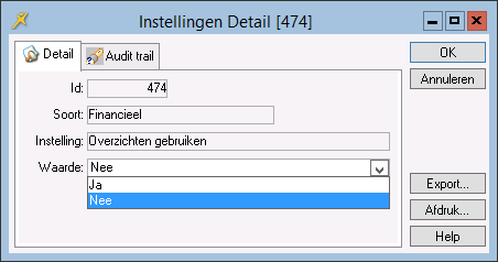 Beheer>Systeembeheers>Instellingen>(tab)Financieel