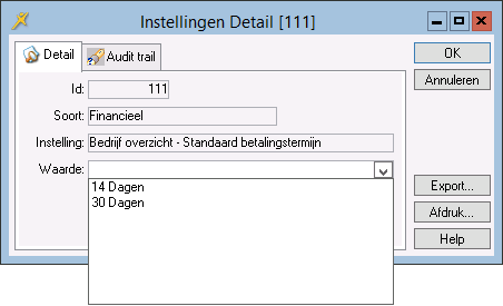 Met de instelling van deze parameter bepaalt u - indien u gebruik maakt van de functionaliteit Faciliteren - wat de standaard bestalingstermijn is voor bedrijfsoverzichten.