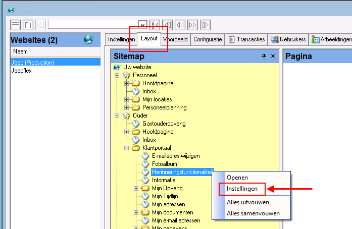 Om het voor de ouder mogelijk te maken om zich via het Klantportaal voor deze functionaliteiten aan- of af te melden zet u in de Layout van de website bij de Herinneringsfuctionaliteit de instelling voor Zichtbaar op de waarde Ja.