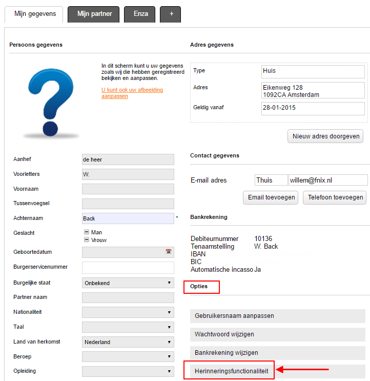 In het Klantportaal wordt op het tabblad Gegevens in de sectie Opties de knop Herinneringsfunctionatliteit getoond.