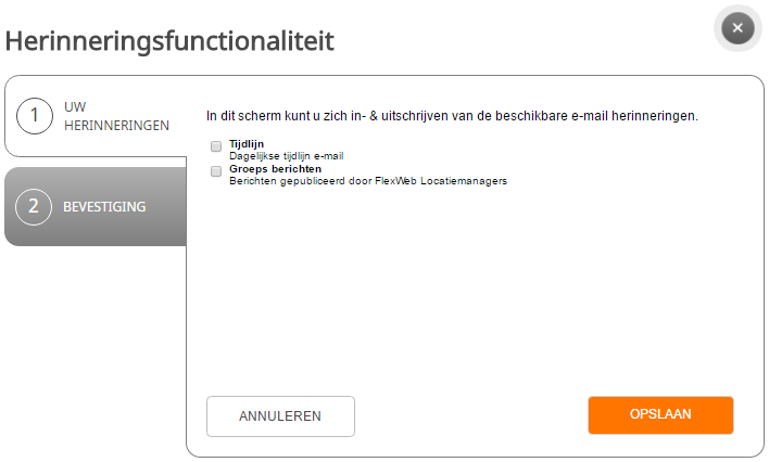 Tijdlijn: Met deze keuze wordt de herinnerings e-mail geactiveerd of gede-activeerd die betrekking heeft op de berichten die op de tijdlijn zijn gepubliceerd.