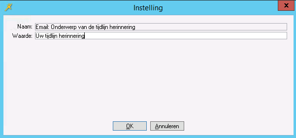 Uw organistatie stuurt herinneringsberichten aan de ouders per e-mail. U geeft met deze parameter aangeven wat standaard in de onderwerp-regel van het e-mailbericht wordt ingevuld. Deze onderwerp-regel wordt gebruikt bij de herinnerings e-mail voor de berichten die op de tijdlijn zijn gepubliceerd.