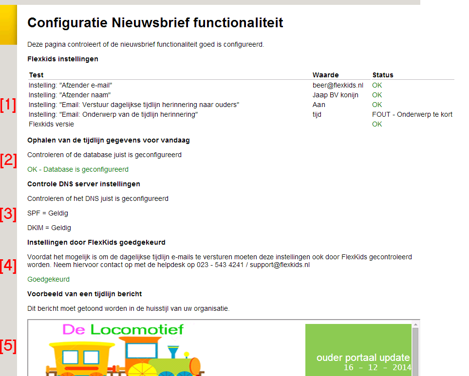 Sectie 1 Flexkids instellingen Hier kunt u zien of de desbetreffende systeemparameters correct zijn ingesteld. Indien er een fout wordt aangegeven dient u deze eerst te herstellen. -Instelling: "afzender e-mail" -Instelling: "Afzender naam" -Instelling: "Email: verstuur dagelijkse tiijdlijn herinnering naar ouders" -Instelling: "Email: Onderwerp van de tijdlijn herinnering"