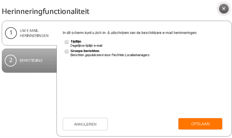 In het Klantportaal kan de ouder zich aan- of afmelden voor de herinnerings-e-mail voor berichten die op de tijdlijn zijn gepubliceerd en voor de nieuwsberichten die door de locatiemanager met de optie Verstuur notificatie zijn gepubliceerd.