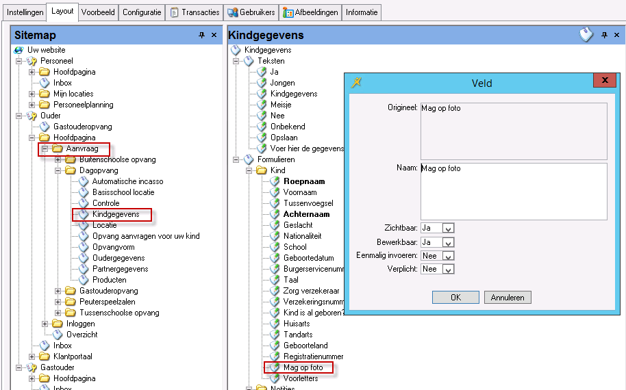 Klik op het tabblad Layout en klap in deelvenster Sitemap de volgende items open: Ouder>Hoofdpagina>Aanvraag>Dagopvang>Kindgegevens: