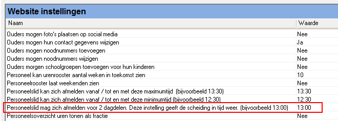 Flexkids heeft een standaard waarde voor de scheidingstijd. U kunt het tijdstip deze scheidingstijd aanpassen. De applicatie-instelling Personeelslid mag zich afmelden voor 2 dagdelen. Deze instelling geeft de scheiding in tijd weerd is een onderdeel van de functionaliteit Afmelden beschikbaarheid.