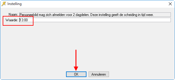 Door het vastleggen van de scheidingstijd legt u de ochtend periode en de middag periode vast. Het is dan mogelijk voor de medewerker om zich voor de hele ochtend of voor de hele middag af te melden.