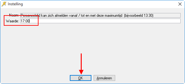 Voorbeeld nadat bij de instelling Afmelden vanaf / tot en met deze maximumtijd de waarde 17:00 is ingevoerd. |