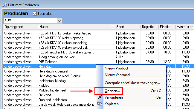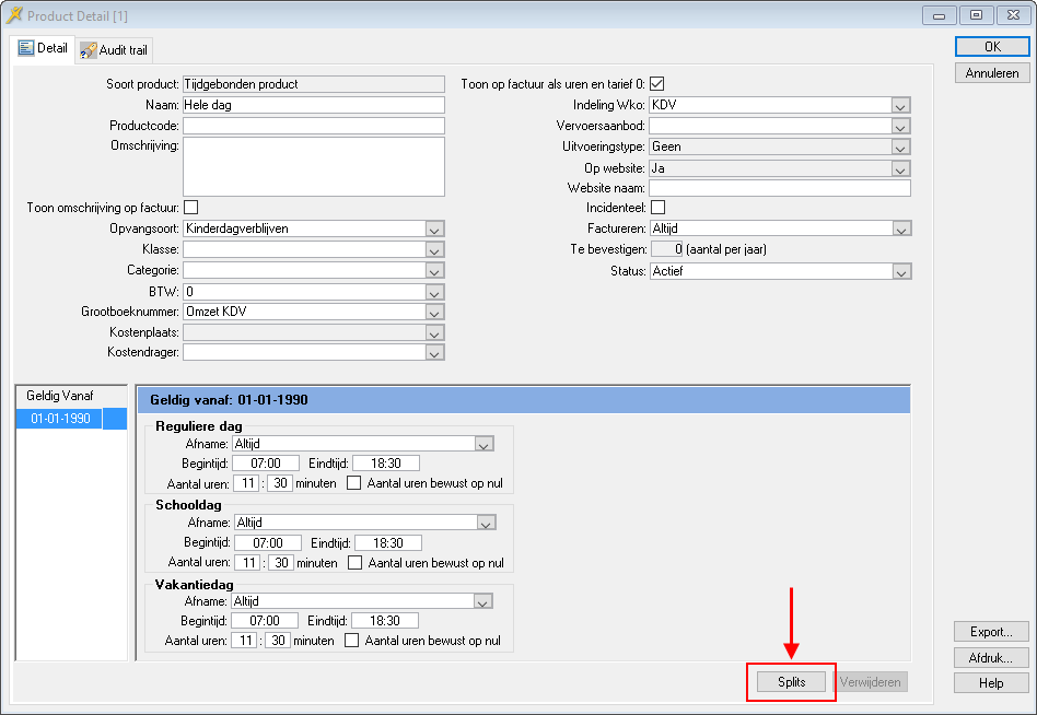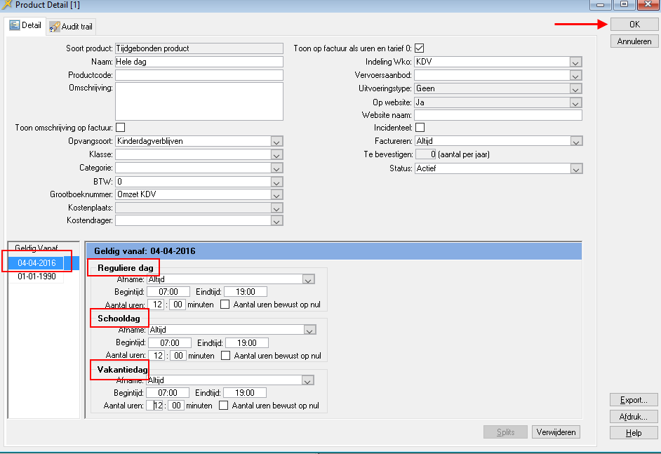 ls u een bestaand opvangproduct wilt wijzigen dan kunt u dat het beste doen door de de geldigheidsperiode van het product op te splitsen. U voegt simpelweg een nieuwe geldigheidsperiode toe aan de reeds bestaande geldigheidsperiode. Vervolgens selecteert u de nieuwe geldigheidsperiode en brengt u de wijzigingen in het product aan. De wijzigingen in de productdefinitie gelden dan alleen voor de nieuwe geldigheidsperiode!