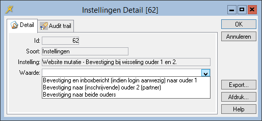 Met de parameter Website mutatie – Bevestiging bij wisseling ouder 1 en 2 stelt u in wie van beide ouders de bevestiging ontvangt zodra de opvangaanvraag is afgehandeld. Bij het instellen kunt u kiezen uit de volgende waarden: