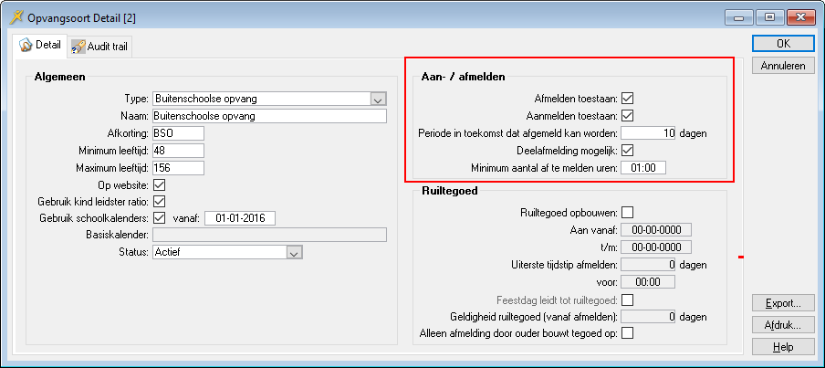 De sectie Aan- / Afmelden in het venster Opvangsoort Detail ziet er als volgt uit:
