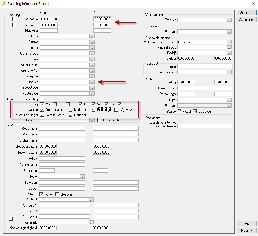 Controleer of de selectievakjes bij Dag, Status en Status per regel zijn ingeschakeld als in bovenstaande afbeelding. Als u met F3 het selectievenster opent zijn de meeste selectievakjes al ingeschakeld en hoeft u in principe alleen nog bij Status de selectievakjes Gereserveerd en Beëindigd in te schakelen.