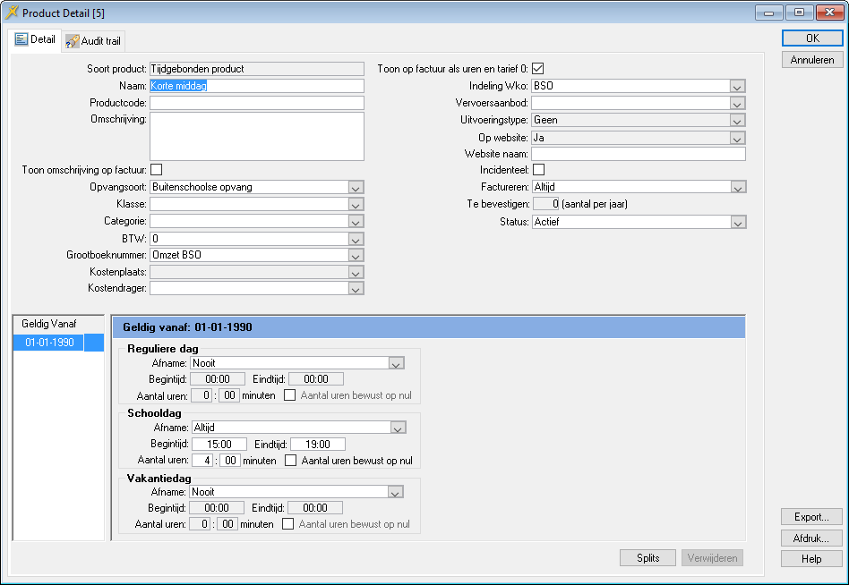 U gaat in deze stap het bestaande schoolproduct wijzigen in een combinatieproduct. U legt een nieuwe periode vast bij het product. Vervolgens geeft u bij die periode op dat zowel de schooldagen als de vakantiedagen deel uitmaken van het combinatieproduct. Daarna kun u voor zowel de schooldagen als de vakantiedagen de begin- en eindtijd van het product aangeven.