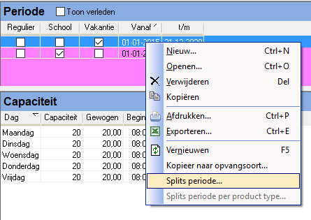 Klik met de RM-knop op de vakantieregel en kies Splits periode... in het contextmenu: