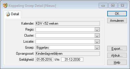 U kunt de aan een groep gekoppelde basiskalender vervangen door een andere basiskalender. In de lijst met basiskalenders selecteert u de nieuwe basiskalender en koppelt deze aan de groep waarbij u aangeeft in welke periode de nieuwe basiskalender van kracht zal zijn.