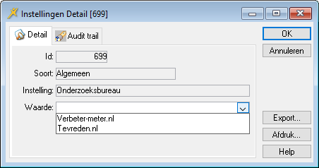 Uw onderneming werkt samen met een extern onderzoeksbureau, bijvoorbeeld Verbeter-meter of Tevreden.nl. Bij de instelling Onderzoeksbureau vult u de naam van het betreffende bureau in.