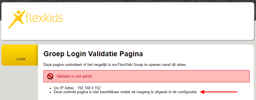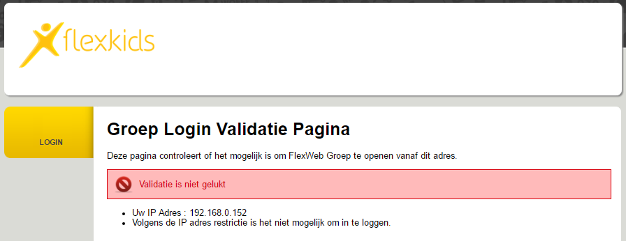 U maakt gebruik van de controle op basis van IP adres. Het IP adres waarmee u probeert in te loggen komt niet overeen met het opgeveven IP adres bij de Website instelling Groep Toegang: IP Adres Filter Definitie.