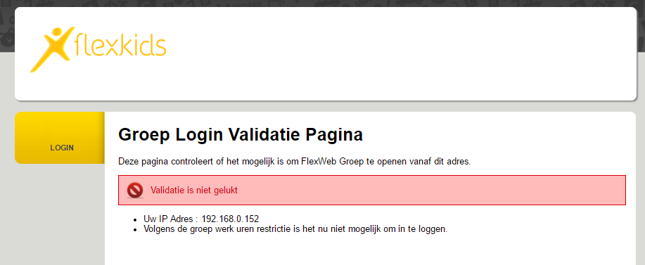 U voert de test uit op een moment dat er geen toegang tot het Groepsportaal mogelijk is. Voer de test uit op een moment dat er wel toegang is tot het Groepsportaal of pas de Website iinstellingen Groep Toegang: Werktijd Eind tijd en/of Groep Toegang Werktijd Start tijd (tijdelijk) aan.