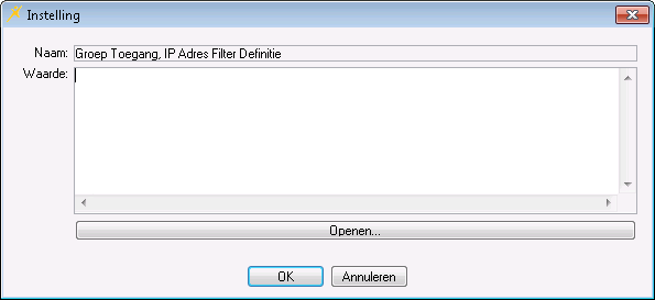 Uw bedrijf maakt gebruik van de functionaliteit om de IP-adressen van uw organisatie expliciet vast te leggen. Bij de Website instelling Groep toegang: IP adres Filter Definitie voert u de IP-adressen in.