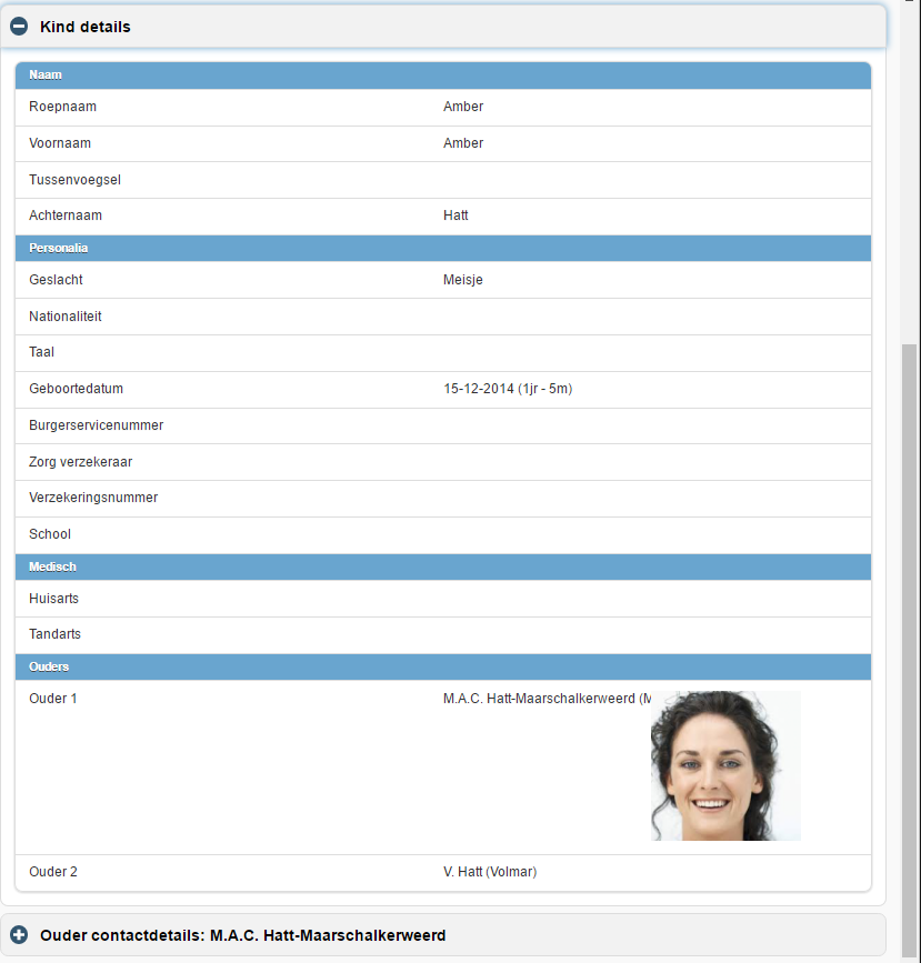 Als de optie Laat Ouder avatar zien op kind pagina is ingesteld op Aan krijgt u in het Kind detail de avatar te zien: