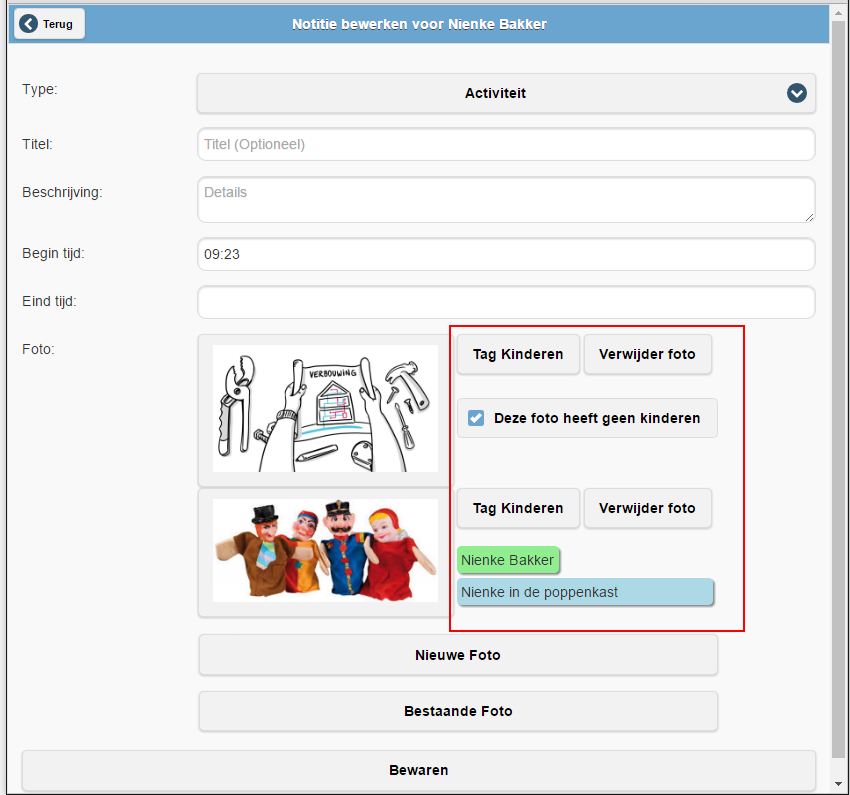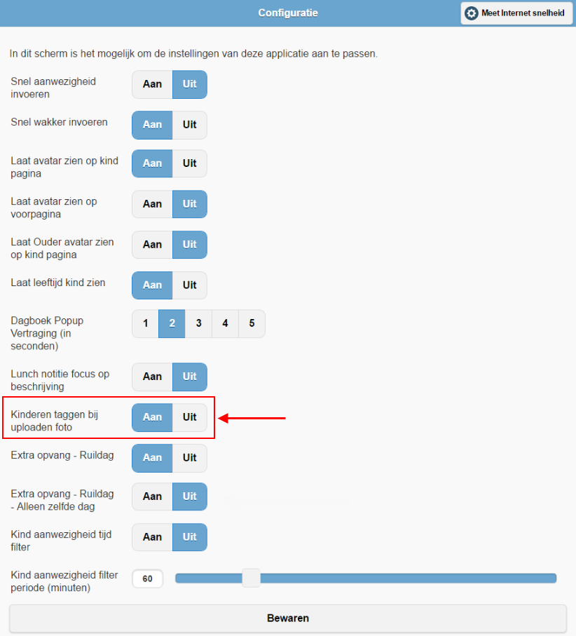 Om het mogelijk te maken om foto's te taggen tijdens het maken van een dagboekonderdeel, vóór het uploaden, zet u in het configuratiescherm de optie Kinderen taggen bij uploaden foto op Aan. Met deze functionaliteit is het ook mogelijk om bij bestaande foto's tags toe te voegen of tags te verwijderen.