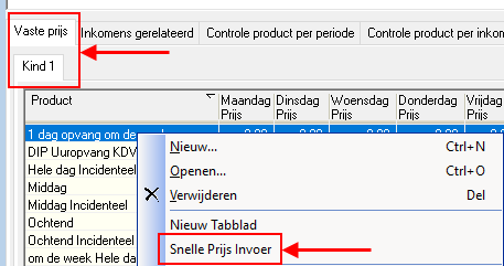Klik met de RM-knop in het tabblad Kind 1 van Vaste prijs en kies Snelle Prijs Invoer.