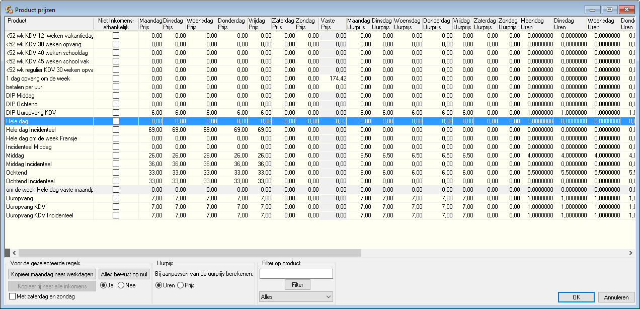 U weet voor de producten de Prijs per keer voor de losse afname. Bijvoorbeeld: het product Hele dag kost 11,5 x 6,50 = € 74,75 .