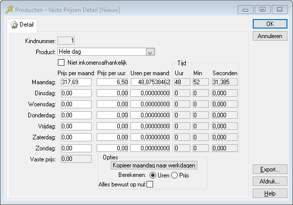 Knop Kopieer maandagen naar werkdagen: Door op deze knop te klikken worden de prijzen en de uren zoals deze bij de maandag zijn ingevuld overgenomen naar de overige werkdagen.