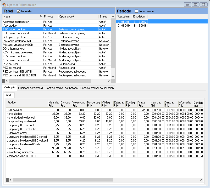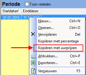 U dient voor het komende kalenderjaar de nieuwe prijzen in te voeren. De prijzen voor de betreffende Prijstabel gaat u verhogen door de uurprijzen van de producten aan te passen. U past de einddatum van de huidige periode aan. U kopieert de huidige periode via Kopiëren met uurprijzen en u geeft de nieuwe periode de juiste start- en einddatum. Vervolgens past u de uurprijzen aan. Deze aanpassing kunt u voor alle producten met dezelfde uurprijs tegelijk doen. Ook is het mogelijk om per product de uurprijs aan te passen.