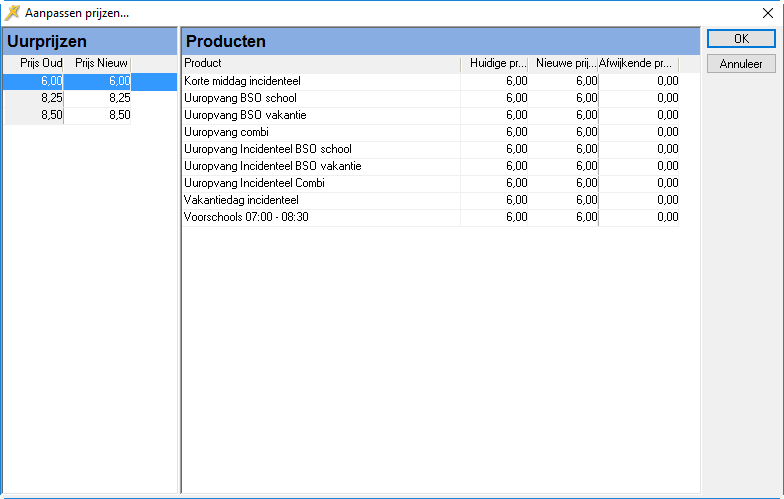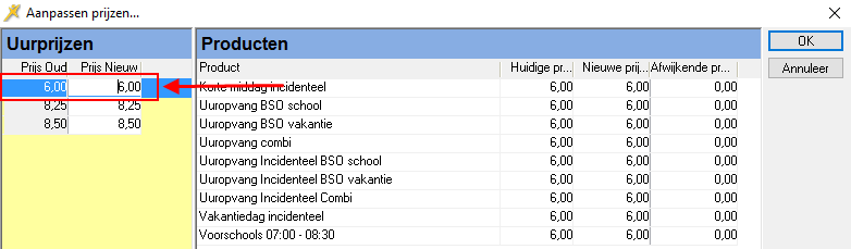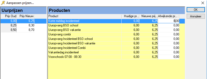 Uitsluitend de producten die in de Vaste prijs tabel een uurprijs hebben worden aangepast. Van de overige producten, bijvoorbeeld producten met een vaste prijs, wordt de prijs niet automatisch aangepast. Deze aanpassing zult u achteraf handmatig dienen uit te voeren.