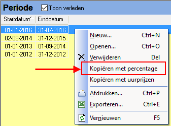 Gedurende het kalenderjaar hebt uw onderneming besloten om voor één of meerdere prijstabellen de prijzen tussentijds te verhogen. De prijzen voor de betreffende Prijstabel worden met een vast percentage verhoogd. U past de einddatum van de huidige periode aan. U kopieert de huidige periode via Kopiëren met percentage en u geeft de nieuwe periode de juiste start- en einddatum. Vervolgens past u de prijzen aan met de gewenste procentuele verhoging.